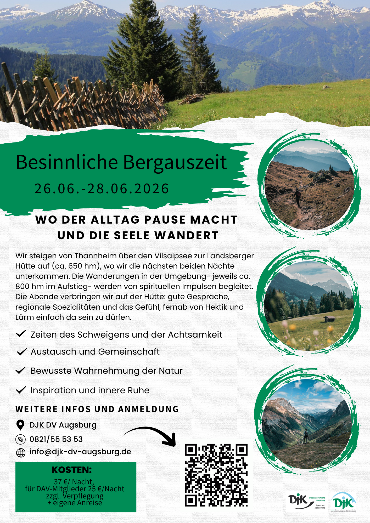 - Bewegung & Spiritualität: Wir steigen von Thannheim zur malerisch gelegenen Landsberger Hütte auf. Die Wanderungen in der Umgebung werden von spirituellen Impulsen, Zeiten des Schweigens und der Achtsamkeit begleitet, um die Natur bewusst wahrzunehmen und Inspiration zu finden.