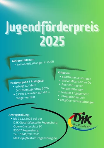Der DJK-Diözesanverband Regensburg verleiht für besondere Leistungen in der Vereins- bzw. Abteilungsjugendarbeit im DJK-Diözesanverband Regensburg einen Förderpreis in Höhe von insgesamt 1000,00 €.